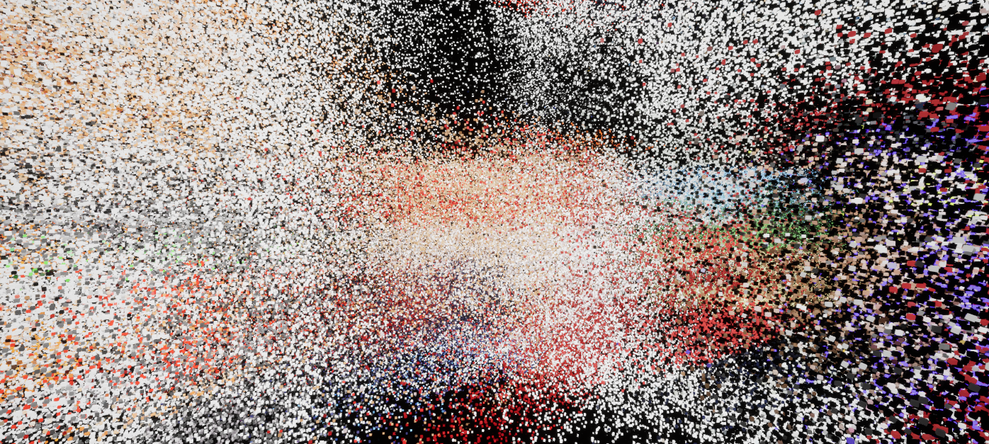 De loin, l’ensemble apparaît comme un chaos visuel — une masse d’informations fragmentées et contradictoires. Ce n’est qu’en adoptant le bon point de vue qu’une image cohérente émerge, illustrant comment notre position influence ce que nous percevons. À l’inverse, lorsqu’on observe une image, il devient impossible de comprendre le reste du nuage, reflétant la logique des chambres d’écho dans les environnements médiatiques numériques.